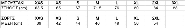 (Μέτρηση από την άκρη 1 εκ. κάτω από τα μανίκια, περίμετρος στήθους διά δύο / Μέτρηση από το υψηλότερο σημείο του ώμου έως το τέλος του ενδύματος)